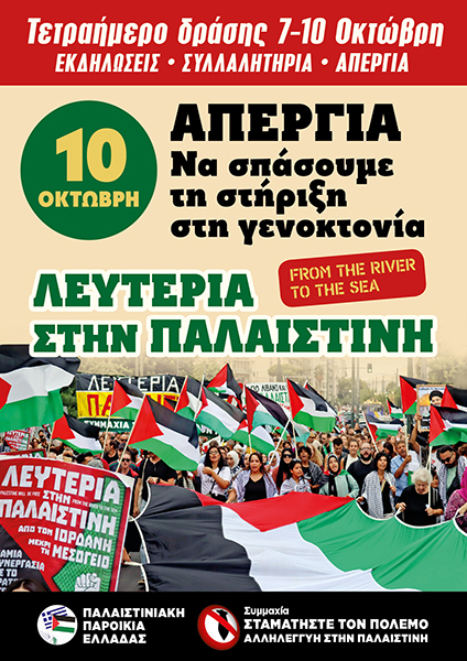 Αλληλεγγύη στην Παλαιστίνη σημαίνει άμεση διακοπή κάθε συνεργασίας με το σιωνιστικό κράτος δολοφόνο! Και μπορούμε να το πετύχουμε! Ο Παλαιστινιακός λαός συνεχίζει να αντιστέκεται στη Γάζα και τη Δυτική Όχθη. Ο αγώνας του ξεσηκώνει ένα μαζικό κίνημα αλληλεγγύης. Κομμάτι αυτού του κινήματος είδαμε με τις δεκάδες κινητοποιήσεις τον Αύγουστο και τώρα με τον παγκόσμιο στόλο που διεκδικεί να σπάσει τον αποκλεισμό της Γάζας. Στηρίζουμε την πρωτοβουλία Global Sumud Flotilla, διεκδικώντας τον ανεμπόδιστο απόπλου και την ασφαλή διέλευση. Τώρα χρειάζεται και μπορούμε να προχωρήσουμε ένα βήμα παραπάνω. Οι πολυάριθμες διαδηλώσεις, εκδηλώσεις και δράσεις αλληλεγγύης να κλιμακωθούν αξιοποιώντας το πιο δυνατό όπλο μας. Την απεργία!
