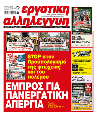 Ώθηση στον ξεσηκωμό θα δώσει και το συλλαλητήριο στο πλευρό της Παλαιστίνης αυτό το Σάββατο 29 Νοέμβρη. Την προηγούμενη μέρα απεργούν ξανά οι εργάτες της Ιταλίας σε αλληλεγγύη με την Παλαιστίνη. Εμπνεόμαστε από το παράδειγμά τους και προχωράμε να μετατρέψουμε την ψήφιση του Προϋπολογισμού σε Πανεργατικό σεισμό ενάντια στην κυβέρνηση και το σύστημα που σπέρνει φτώχεια και πόλεμο.